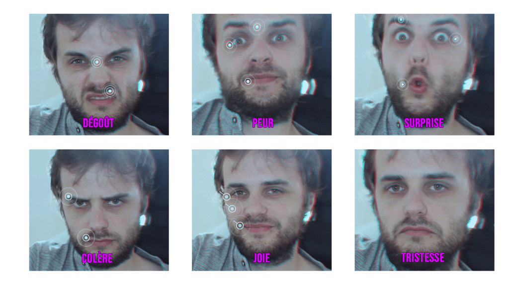 - la joie : l’entièreté des joues remonte du coin des lèvres, aux yeux et oreilles ;