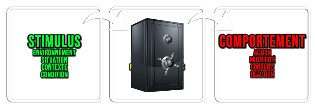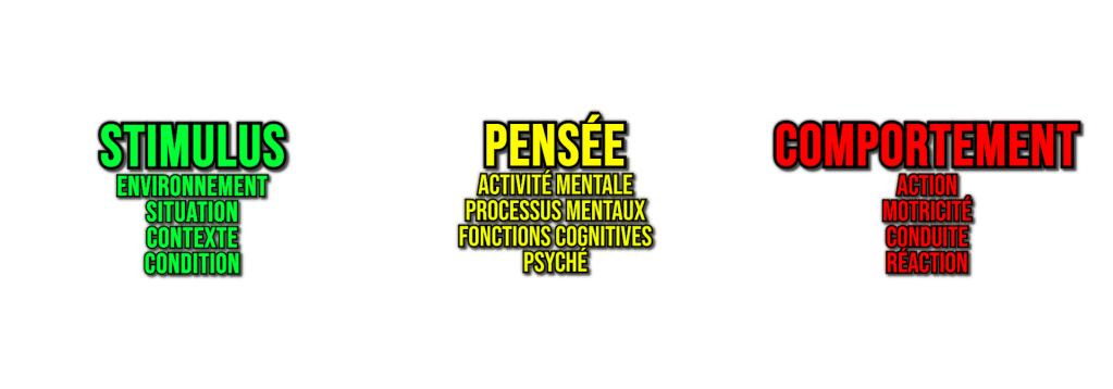 Et cette manière d’appréhender les choses – où à partir des comportements on essaie de cartographier les chemins de pensées (représentations, processus mentaux, etc.) – c’est déjà davantage de la psychologie. L’étude des comportements n’est pas l’objectif réel de la psychologie. Le réel objectif est de les utiliser pour comprendre ce qu’il y a avant. Par contre – et c’est là que l’approche comportementaliste nous alerte – dans tous les cas, c’est sûr, on ne peut pas mesurer directement les pensées. On ne le peut que de manière indirecte, via l’étude des comportements.