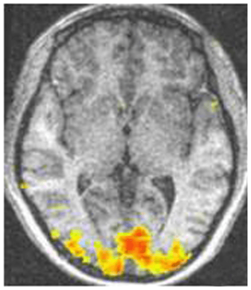 Exemple. Sur cette imagerie cérébrale ci-contre (Figure 6), nous avons une coupe du cerveau. Ici est colorée une partie du lobe occipital à l’arrière de notre tête, notamment connue comme nécessaire pour percevoir avec les yeux. On l’appelle d’ailleurs dès fois l’aire visuelle. Mais ce n’est pas parce que là, ça « s’allume » ou ça « s’active », que c’est forcément que la personne voit quelque chose avec les yeux. Encore une fois, ce n’est pas une observation causale et directe mais bien une observation indirecte. Peut-être que la personne imagine seulement voir quelque chose mais les yeux fermés. Peut-être que la personne est aveugle et cette zone cérébrale se « ré-organise » pour la perception spatiale du son. Peut-être que même ce n’est qu’une activité ambiante normale (« bruit continu ») sans perception visuelle (« discours fonctionnel »). On sait par exemple que toute partie du cerveau, aussi spécialisée soit-elle, est tout autant sollicitée lors de mouvements corporels (Jordana Cepelewicz, 2019, Quantamagazine.org citant : (Niell & Stryjer, 2010 https://doi.org/10.1016/j.neuron.2010.01.033) & multiples autres études). Ainsi, sans contexte, ni méthodologie, on peut faire dire tout et n’importe quoi à des images, même – et je dirais même surtout – celles du cerveau.