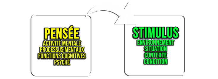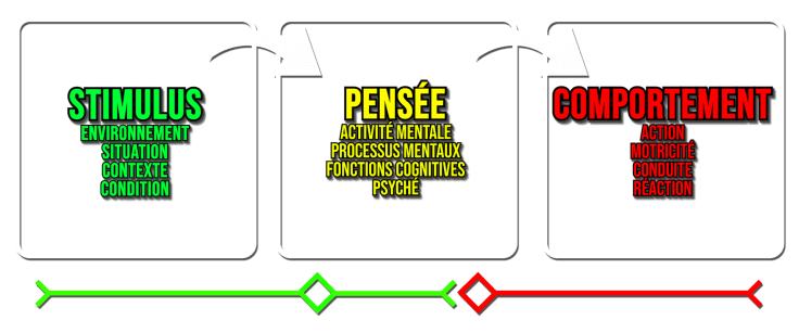 Une première manière d’agencer ces boîtes serait d’ignorer le boîte des pensées. Telle une boîte noire inaccessible. On se retrouve avec une approche comportementaliste (béhavioriste) de la psychologie où tout ce que l’on peut observer et mesurer c’est ce qu’il y a en amont – le stimulus – et en aval – la réponse comportementale. Un peu comme un réflexe oui. Comme si tous nos comportements étaient des réflexes ou des automatismes appris.