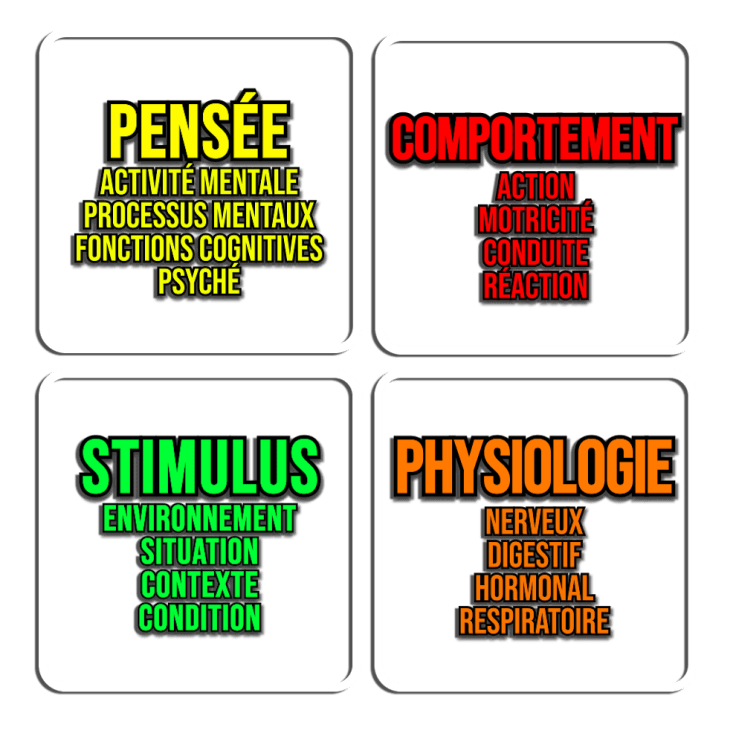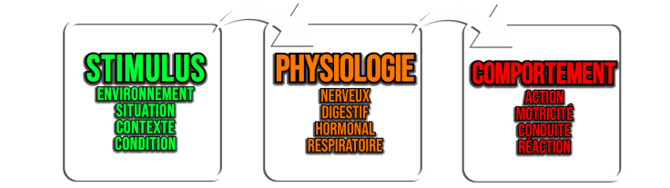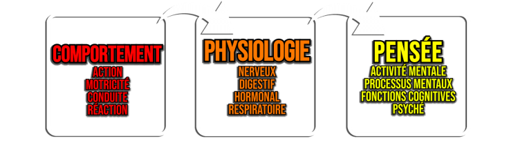 De fait, activité mentale et pensées ne sont pas nécessaires pour observer un comportement. Un comportement peut juste être le résultat d’un réflexe vis-à-vis d’un stimulus particulier. Agir sans même y penser ! Tout ce qui est mécanisme biologique de notre corps, entre un stimulus et comportement, on va appeler ça la physiologie : système nerveux, système respiratoire, système digestif, système cardiaque et circulatoire, etc.