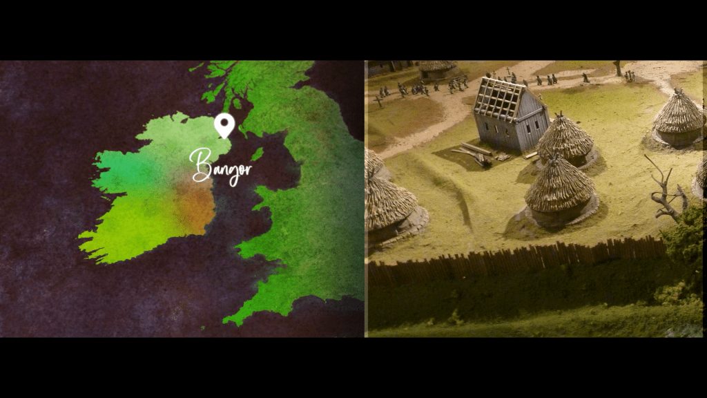 Ce mode d’organisation politique et religieux, c’est ce qu’on appelle aujourd’hui le christianisme celtique. Avec une abbaye comme lieu central, il ne faut pas imaginer une grande et solide abbaye faite en pierre et colossale. Ci-dessous est illustrée une tentative de reconstitution de l’Abbaye de Bangor fondée en 558. Souvent, les monastères irlandais sont des endroits calmes et ouverts. Il n’y a ni cloître, ni réfectoire, tout se fait en plein air. Les oratoires sont rares et il y a à tout casser deux églises. Le monastère renferme principalement des granges et des petites huttes pour dormir.