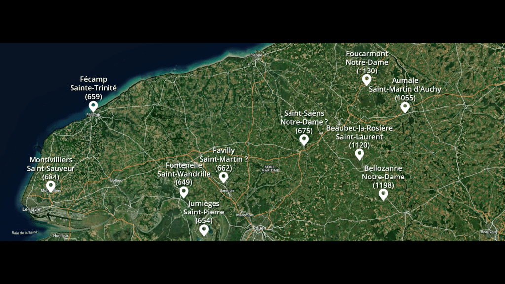 Être bien vu de Saint-Philibert (ou Filbert né autour de 620 – et décédé a priori en 684) ce n’est pas rien. C’est lui qui dirige et a fondé l’abbaye de Jumièges en 654. Philibert voulait y mettre en pratique sa propre vision de l’organisation religieuse, accompagnée et fortement aidée par la royauté. Ouais les subventions de l’État à l’époque ça existait déjà. Rois et reines francs cherchaient à unifier le royaume franc. Et investir à travers des sortes d’écoles prêcheuses que sont les monastère était une manière de faire. Bon nombre de moines disciples ont ainsi exporté la chrétienté voire carrément fondé des lieux et villages. Comme Sidoine avec Saint-Saëns donc.