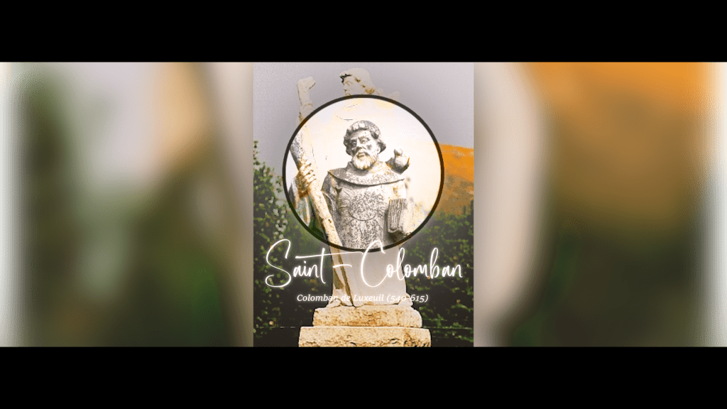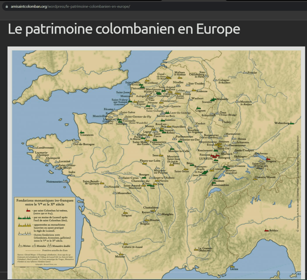 C’est avec cette dégaine, et surtout armé de la parole et leur érudition comme on a pu l’évoquer, que les moines irlandais commencent à sillonner l’Europe, d’ouest en est. Rouen, Noyon, Reims pour finalement fonder en 587 un monastère Annegray et en 590 la célèbre et imposante abbaye de Luxeuil. Ce voyage n’est pas le résultat de n’importe quel moine irlandais. Je parle depuis tout à l’heure du grand moine voyageur : Saint-Colomban, qui est à l’origine d’une quarantenaire de monastères dans nos campagnes européennes.