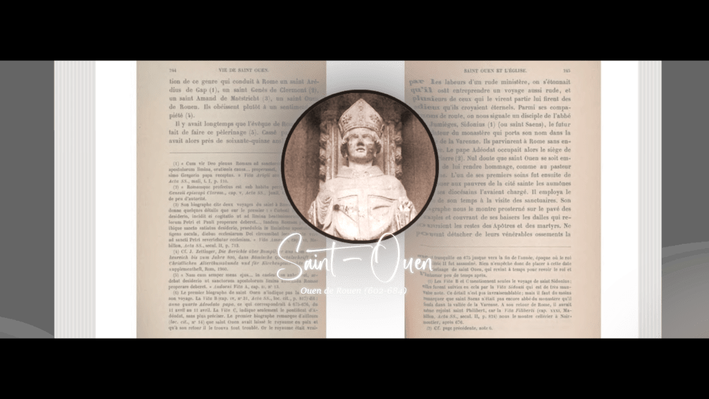 Enfin… je dis copain-copain mais ils avaient au moins 40 ans d’écart. Lors du pèlerinage, Sidoine avait la trentaine alors que Ouen avait plus de 70 ans. C’était peut-être davantage une relation de maître à élève spirituel. J’en sais rien. Pour se rendre compte du temps qui passe, faisons un petit point sur qui est Saint-Ouen. Je m’attarde sur plusieurs personnages, Saint-Colomban, Sain-Ouen, Saint-Philibert, parce qu’en réalité on ne connaît rien de la vie Saint-Saen. On connaît son existence uniquement grâce aux écrits des autres et ses événements.