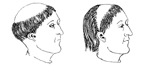 Il croise alors le regard amusé d’enfants et autres curieux locaux, médusés par leur coiffure pour le peu atypique. La tonsure du moine irlandais n’est pas comme celle des moines romans et francs : un rond au milieu des cheveux. Non. Sur eux, le creux sans cheveu forme une sorte de triangle d’une oreille à l’autre.