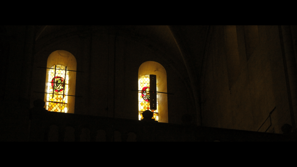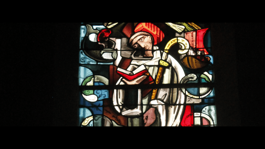 Ce fameux vitrail est le plus accessible, à droite dès qu’on rentre de l’église. Moderne car réalisé début 1940, on y retrouve quelques éléments clés de sa vie. Au niveau de sa tête, un bateau. Clairement, un bateau provenant d’Irlande pour arriver à Jumièges. Sur le même niveau, on y voit une baleine, parfois symbole de renouveau et de renaissance spirituelle. Comme si, quittant son Irlande, il repartait de zéro. En dessous on voit une sorte de baril. Est-ce pour signifier son rôle de cellérier ? Puis tout en bas on y voit des bâtisseur, pour symbolise Saint-Saen comme fondateur. Tout en haut, un bâtiment dressé aux tuiles orangées. Serait-ce le monastère fondé ou bien l’abbaye de Jumièges dans laquelle il a séjourné ? On y voit quand même beaucoup de têtes, comme si c’était très fréquenté.