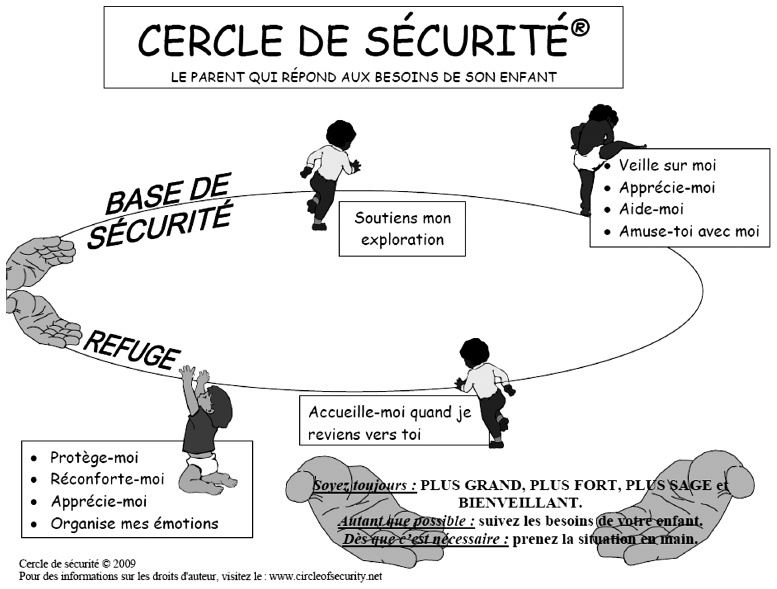 Ce cercle fléché qui fait un aller-retour en dehors de sa zone de confort, est pas mal popularisé dans le monde anglophone par ce qu’on appellerait en français le Cercle de Sécurité ou Cercle de Sérénité, souvent repris au sein d’institutions et formations privées (e.g., Circle of Security) pour appliquer ces principes de la théorie de l’attachement, aux comportements parentaux. Dans l’éducation des enfants donc.