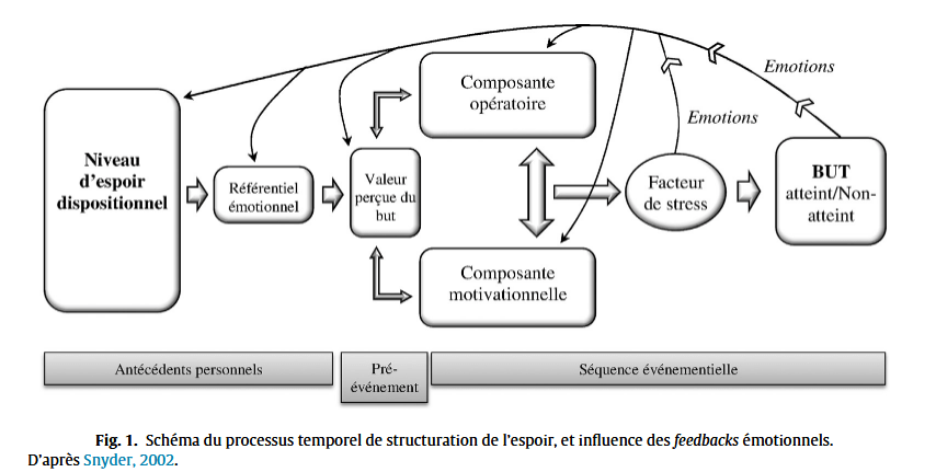 | « Une des limites formulées à l’égard du modèle de Snyder est aussi qu’il ne permet pas d’expliquer pourquoi certaines personnes développent de l’espoir bien qu’ils sentent qu’ils ne sont pas en mesure de faire quoi que ce soit pour atteindre leur(s) but(s). » (Delas, Martin-Kumm & Fenouillet, 2014) |