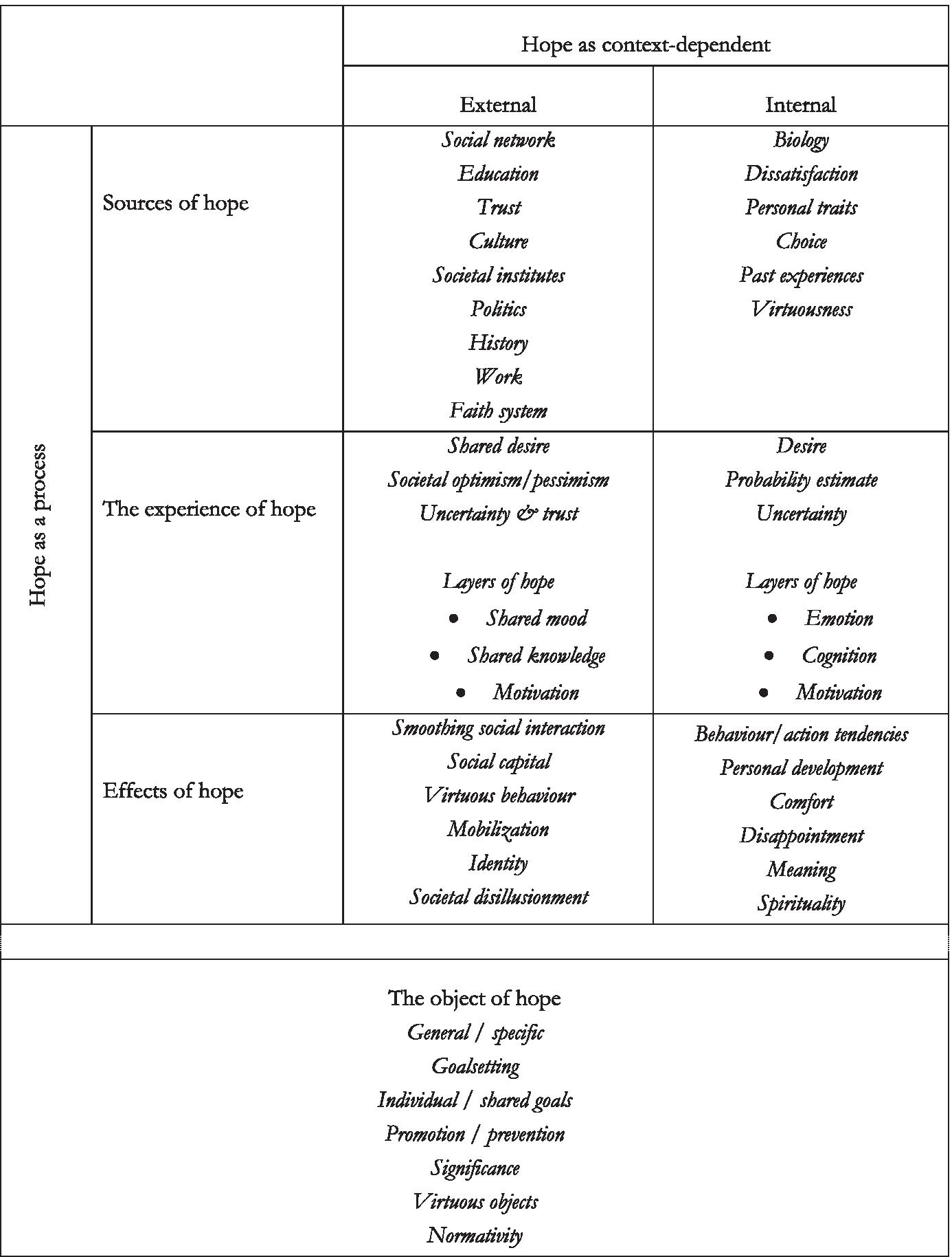 Chaque musique provoque une certaine émotion et peut être jouée de différentes manières, comme dans un certain en genre, un certain rythme, une certaine tonalité ou modalité (ionien : optimisme ; dorien : espoir), etc. La musique c’est un seul concept pour plusieurs manières de l’exprimer. Hé bah, même chose pour l’espoir. C’est un seul concept, pour plusieurs manières de l’exprimer. Et pour mettre des mots et catégories sur les différentes manières de l’exprimer, plus d’une dizaine de théories, avec parfois ses questionnaires, ont été développés.