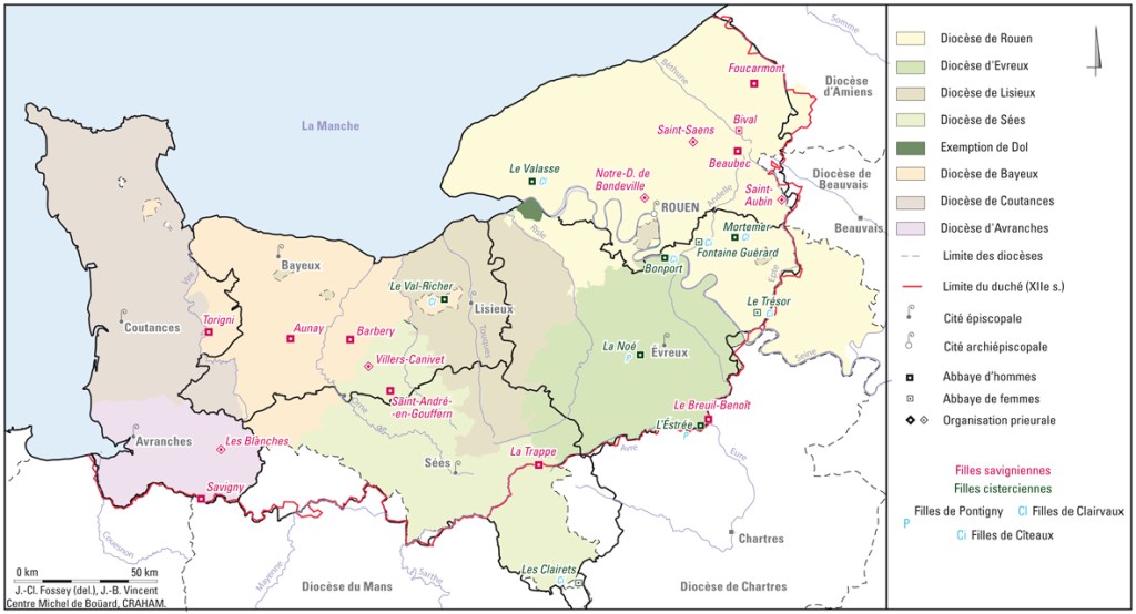 L’origine du monastère des femmes de Saint-Saëns n’est a priori pas cistercienne mais savignienne. L’archéologue Jean-Baptiste Vincent distingue l’ordre monastique de Savigny parce que c’est la première réforme imposante fondée dans le coin en 1112. C’est cette réforme qui rayonnera parmi les nobles jusqu’en Angleterre. Quand à la réforme cistercienne, la première abbaye en Normandie est Mortemer en 1134-1137 (Vincent, 2015). Mais confondre les deux ordres (savigniens et cisterciens) n’est pas si dérangeant, puisqu’ils fusionneront rapidement en 1147 sous l’ordre cistercien (par peur de l’implosion de l’ordre savignien) : on a alors 32 maisons qui s’affilient aux cisterciens (Vincent, 2016).