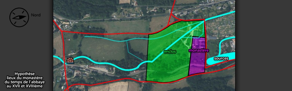 Pourquoi le monastère a été installé ici ? 3 arguments sont cités. Déjà de 1) parce qu’une population conséquence y habitait pas loin. Les terres sont assez isolées par rapport au bourg et autres zones habitées tout en étant proche du réseau routier. De 2) pour certains, c’est l’endroit originel du monastère fondé par Saen en 675 (e.g., Sandret, 1866, p.78 ; de Vesly, 1915) et non pas au Camp-Souverain ou au centre-ville. Difficile à dire ce qu’il y avait et à quoi ressemblait cet endroit avant l’installation du monastère dans tous les cas. D’autant plus que les cours d’eau ont été remodelés.