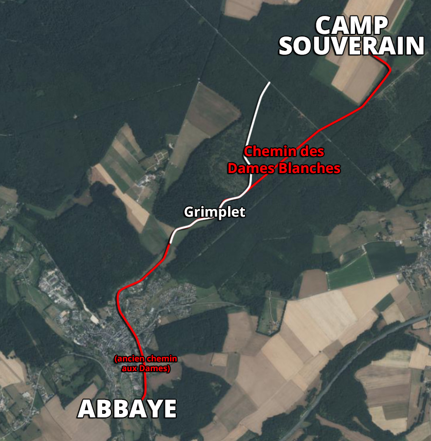 Ce chemin évite les montées abruptes du Teurtre pour arriver au Camp Souverain. Il longe le creux de la vallée alignée à l’actuelle Rue d’Haussez, pour monter par le Grimplet et finalement continuer tout droit vers l’actuel chemin boueux qui est encore aujourd’hui appelé Chemin des Dames blanches. (Et bien que cette partie là, le reste est aujourd’hui appelé Route forestière du Grimplet.) Un total d’environ 6 km.
