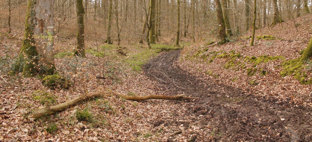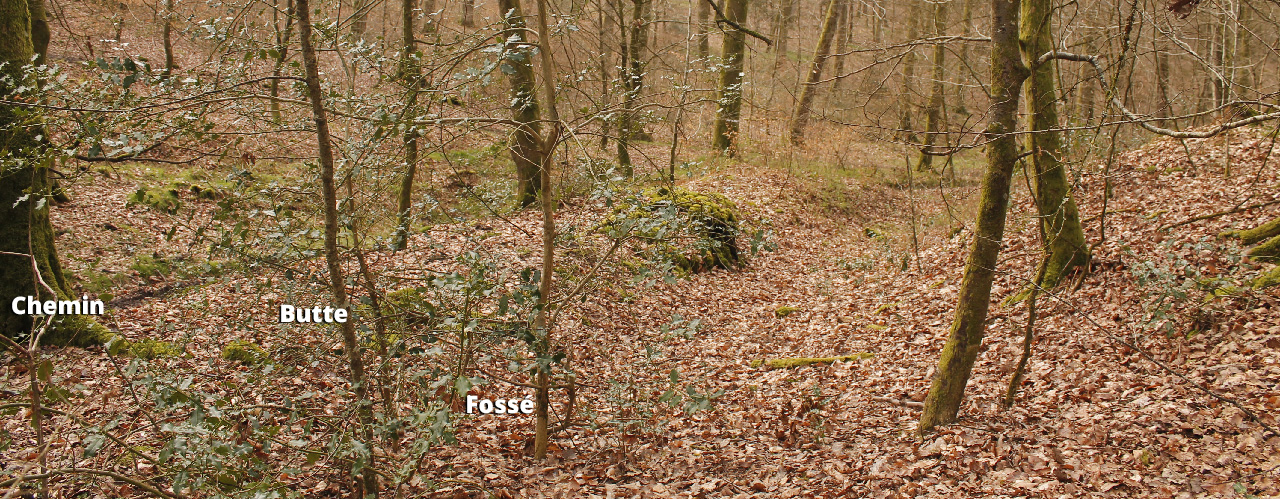 Sur l’actuelle portion boueuse encore appelée Chemin des Dames Blanches, de part et d’autre du chemin sont repérés des fossés sur plusieurs mètres après le patte d’oie en se séparant du Grimplet. Une délimitation pareille, je dois avouer trouver ça étrange pour un chemin en pleine forêt et en plus au fond d’une vallée…