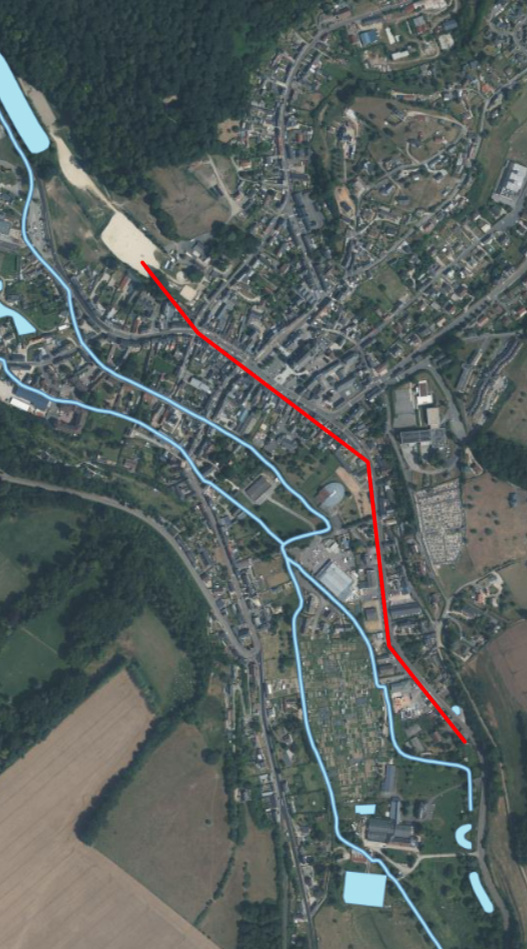 Construit au XIXème siècle, le premier aqueduc connu traverse la ville pour alimenter « l’étang du château ». Ce château dont on parle serait le logis d’Almazan. Alain Barra explique que ce sont « les étangs du château situées route de Bellencombre » et que cet aqueduc fut détruit par les allemands en 1944 (Bachet, 14 Janvier 2025 pour Le Réveil). En tout cas, il l’a été partiellement puisqu’il a ensuite servie à nettoyer les rues principales et alimenter la citerne d’incendie de la place d’église jusque dans les années 1960. Quant à la fontaine Dillard, elle est alimentée par une autre canalisation en fonte réalisée lors de sa construction. Confirmé par les rapport des années 1960 (ficheinfoterre) séparant bien deux conduits : l’aqueduc en maçonnerie et la canalisation de la fontaine en fonte. Sauf si ça a changé depuis les années 1960 ?