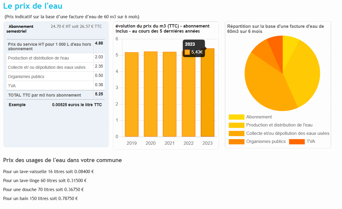 « Le prix total du service de l’eau se répartit à parts proches entre les charges des services d’eau potable et les charges des services d’assainissement (41 % pour l’assainissement collectif, 38 % pour l’eau potable). Les 21 % restants sont constitués d’une taxe (TVA) et de redevances versées aux agences ou offices de l’eau, et aux Voies Navigables de France (VNF) ou autres le cas échéant. (Obs-eau) » Sur Saint-Saëns au total, en 2023, le prix du m³ d’eau était de 5,43 € Toutes Taxes Comprises (assainissement + eau potable). Ci-dessous on a ce que partage Veolia sur son site internet pour justifier son prix en 2023 :