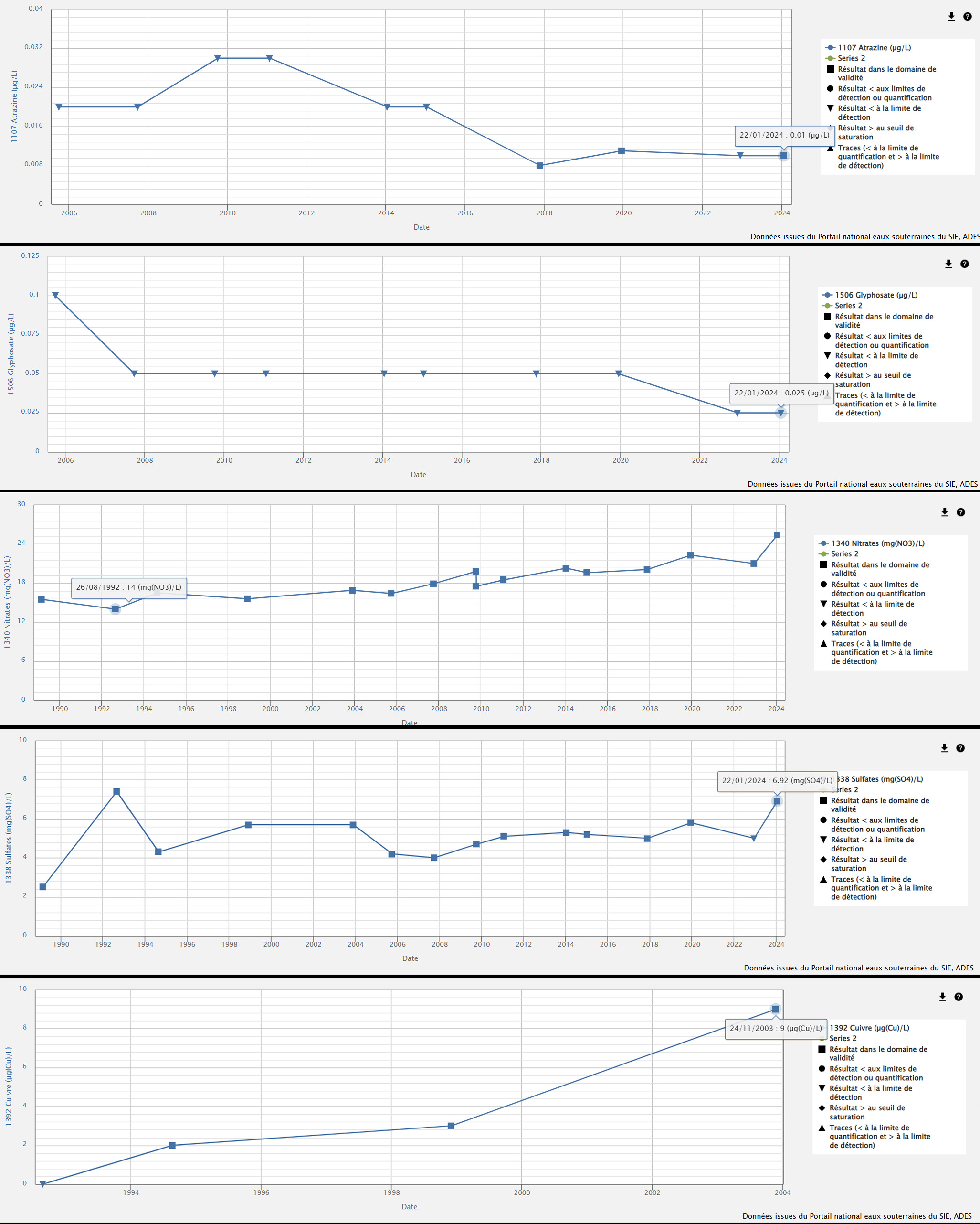 Parmi toutes les mesures réalisées, certains éléments sont peu mesurés (voire pas du tout), comme le cuivre dont la dernière mesure remonte à 2003, alors que l’élément est de plus en plus utilisé. Contrairement aux engrais, globalement, les traces de pesticides ne font que baisser année par année. Par exemple, des traces de l’atrazine, herbicide fortement utilisé par le passé, restent encore dans l’eau bien qu’elles soient en baisse d’année en année. Le glyphosate également, pourtant encore utilisé.