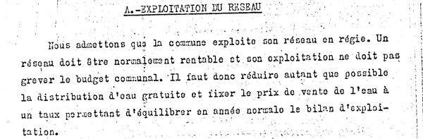 Ci-dessus, un extrait de la réponse du ministère de l’agriculture en 1936, par rapport à l’installation du réseau d’eau potable. « Un réseau doit être normalement rentable et ne doit pas grever le budget communal, » est-il écrit. À croire que même en 1936 sous le gouvernement de gauche de Léon Blum, le capitalisme et la recherche de rentabilité – quitte à faire payer les gens pour leurs premières nécessités – étaient déjà bien installés…