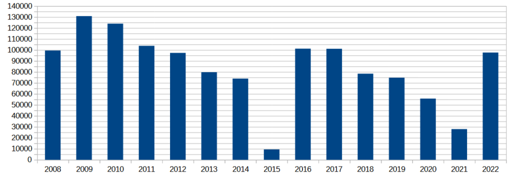 Volumes des prélèvements d’eau potable en m³ par année par Saint-Saëns référencés sur bnpe.eaufrance.fr. Au niveau du bourg, sur Saint-Saëns donc, principalement la station de pompage communale au niveau de l’Abbaye. J’imagine que lorsque le volume de prélèvement de l’eau est presque minime, c’est parce que la plupart de l’année l’eau provient d’ailleurs, comme l’eau du Syndicat de l’eau des 3 Sources ?