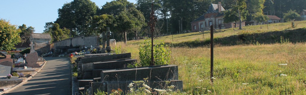 entre le relief à droite bien mis avant avec le soleil rasant, et le mur du cimetière au fond à gauche.