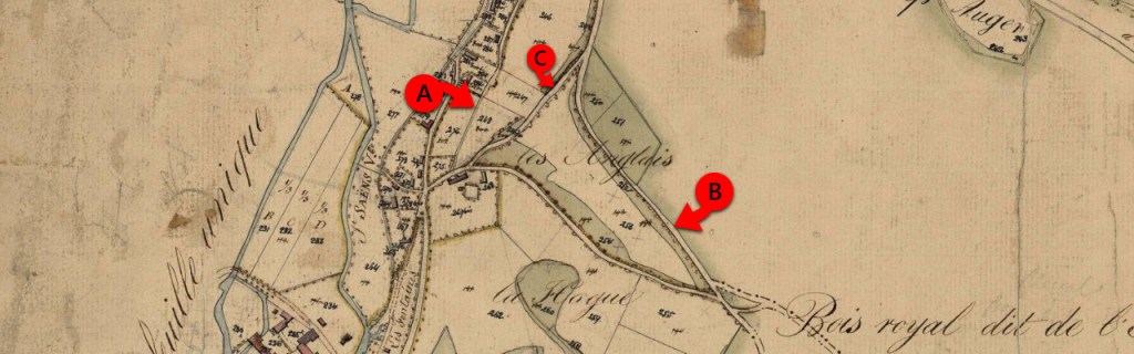 L’actuel chemin aux Anglais (cadastre napoléonien : flèche A), aussi appelé sente aux Anglais, est récent. Comme on peut le deviner sur la cadastre napoléonien ci-dessus, le chemin dessiné est très fin, supposant qu’il n’était pas du tout un axe majeur, voire juste un vulgaire raccourci. Aujourd’hui il signifie ce chemin à l’ouest du cimetière mais aussi la rue descendant jusqu’à la départementale. Cette dernière partie est bien plus ancienne et menait à l’abbaye royale.