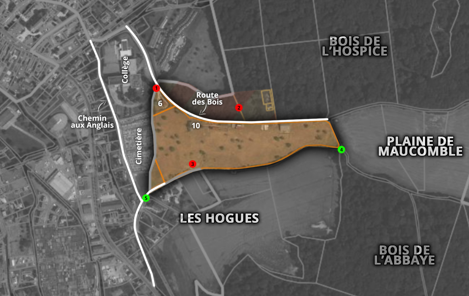 C’est anecdotique mais sur la parcelle résidentielle du 6 Route des Bois, des cadastres marquaient une mare. Aujourd’hui elle n’existe plus ? À part ça, Les Anglais a toujours été une zone de prairies au milieu de deux carrefours : point (4) et (5) sur la map. L’un plus campagnard pour partir vers l’est (4), l’autre plus citadin et historiquement extrêmement fréquenté (point 5).