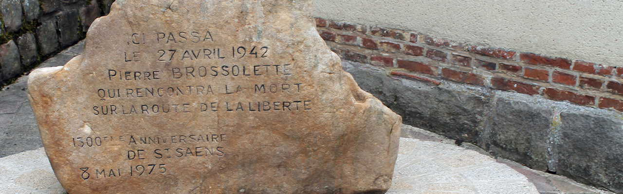 L’actuelle route des Bois (cadastre napoléonien : flèche B) a un petit historique derrière elle. D’abord, originellement donc, c’est elle qui s’appelait chemin aux Englées. Mais elle a aussi une certaine histoire durant la seconde guerre mondiale. C’est par là que les résistants passaient à pieds, la nuit, pour atteindre les plaines avant Maucomble : là où atterrissait clandestinement des petits avions pour rejoindre l’Angleterre. Pierre Brossolette était l’un de ceux-là. D’où la stèle en sa mémoire tout en bas de la rue (photo ci-dessus). Mais à l’origine, lors de sa commémoration le 8 mais 1975, elle avait été disposée à l’angle après le collège (point 1 sur la carte en début de page) :