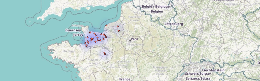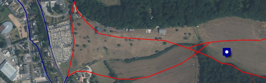 Le dernier endroit curieux est un lieu en friche, en plein milieu des champs et prairies des Hogues (point (4) sur la première map). Aucune idée de ce qui s’y trouve mais : c’est là que plusieurs parcelles de cadastres se séparent ; et c’est également là qu’aurait passé l’ancien chemin rural de la Hogue (et non pas au fond du vallon comme aujourd’hui), si l’on en croit mes retranscriptions du cadastre napoléonien (~1808) sur les images satellites actuelles :