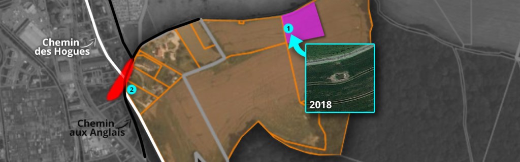 Qui dit relief et mini vallon, dit aussi ruissellement de l’eau et bassin versant (43 hectares, ruissellement de 1,2 km de long sur 6,64 % de pente). Et parmi le Plan Local d’Urbanisme (de 2024) ce ruissellement est clairement écrit comme facteur à causer des inondations. On y écrit : « il est donc proposé de limiter les apports générés par ce bassin versant par la mise en œuvre d’un bassin de régulation des eaux pluviales. » Où ça ? Sur le schéma proposé ci-dessous, ça correspondrait au terrain en violet. Lieu d’où il n’existe aujourd’hui (2025) rien et qui pourtant détenait pendant longtemps un petit bassin d’eau stagnante (abreuvoir ; point (1) sur les schémas de cette page) qui a été supprimé entre 2018 et 2020.