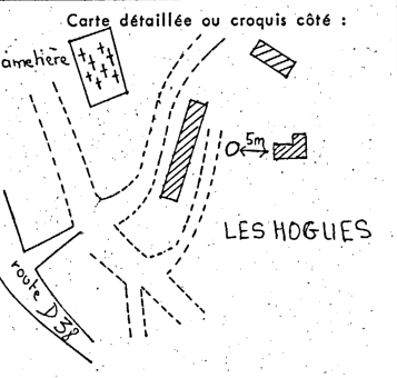 C’est depuis 1975 environ, que le lieu a pris son allure actuelle. C’est l’époque où toute la zone a été remaniée. On officialise la toponymie : des chemins (Route des Bois, chemin aux Anglais) aux lieux-dits (Les Anglais, Les Hogues). On perce officiellement le chemin aux Anglais. On construit le collège. On détruit la vieille ferme des Hogues (schématisée ci-contre où en photo sur l’image satellite de 1952 plus loin). Il n’en reste qu’une bâtisse : maison du n°7. Parcelle où le puits est toujours là d’ailleurs. Aux alentours, on goudronne et on délimite des parcelles résidentielles ici et là (3).