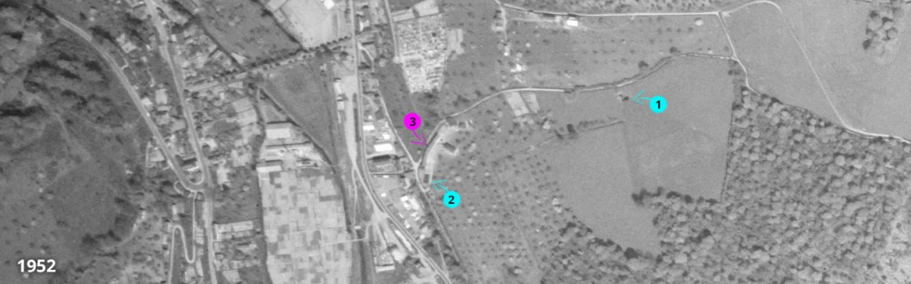Quelques observations parmi le cadastre du coin. Il existe une toute petite parcelle de 36 m² (point (5)) avec un pseudo-bâtiment en agglos semblant comme perdu et déjà là sur les premières photos satellites. Aucune idée de ce que ça représenterait. Autre chose, parmi les parcelles résidentielles, celle la plus à l’ouest (parcelle du n°11) cache un point d’eau, a priori le même depuis les années 1950 (point (2) sur les maps). Est-il encore plus vieux et datant originellement de la ferme des Hogues ? Sûrement. En quelques dates :