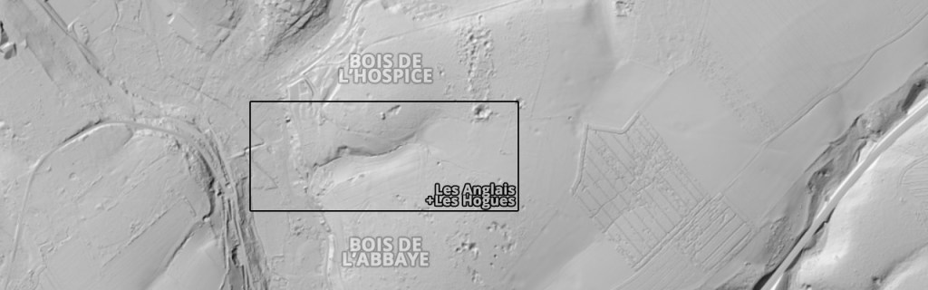 La Hogue désignant originellement la colline, le lieu est évidemment tout en relief. Aujourd’hui le lieu-dit correspond au mini vallon et son versant sud (son versant nord étant Les Anglais). Pour évacuer les doutes que le nom des Hogues puisse dénommer le lieu d’anciennes exploitations des ressources du sol du temps gallo-romain, ci-dessous une image satellite du LiDAR nous montre le relief du sol le plus précisément possible. Les Hogues est coincé entre le Bois de l’Hospice et le Bois de l’Abbaye cachant encore les excavations minières :