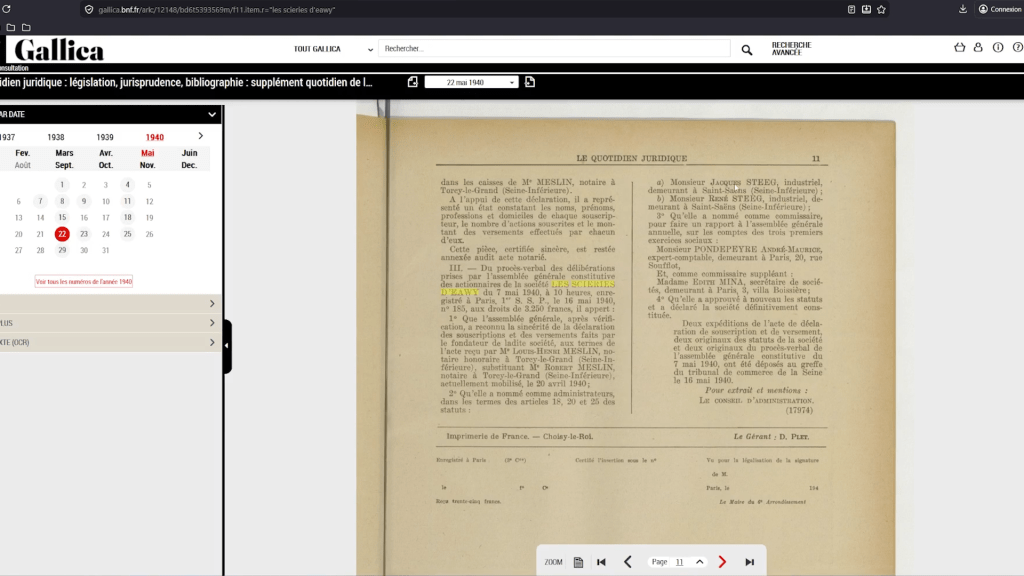 | Les Steeg sur Saint-Saëns L’entreprise de Jacques Steeg (et son frère René Steeg), s’appelait Les scieries d’Eawy fondée le 20 avril 1940. Le siège sociale était à Paris. L’usine existait malgré tout déjà depuis au moins 1933, ayant eu un différend avec le mécanicien Marcel Marchal lors du déplacement des machines et outils depuis la gare. Un événement d’abord diffusé dans les journaux par la demande Jacques Steeg lui-même dont on peut suivre la saga en fil de des mois : lettre de mars 1933, mars 1933, avril 1933, mai 1933. On cite aussi les ouvriers Raoul Legras en mars 1933 ou Louis Buleté en août 1933. L’usine se situait à Roville, mais savoir où précisément je n’ai pas de confirmation. Sûrement dans les locaux de l’ancienne teinturerie, j’imagine mais c’est à confirmer Après la guerre, on retrouvera un certain René Steeg en 1948 dans le Calvados. Quant à Jacques Steeg, il est noté comme maire pendant un temps en 1945, avant que Simone Vallès le soit. Aucune idée du pourquoi ces dénouements. Je verrai en creusant mes recherches autour de Simone Vallès. Peut-être que les Steeg on définitivement quitté Saint-Saëns après 1945. Enfin, à cette même époque, un autre Steeg était patron d’une autre industrie sur Saint-Saëns. Pierre Steeg détenait la chemiserie sur la route du Pont-du-Thil : cf. page sur les industries. Aucune idée s’ils étaient de la même famille. Jacques et René, par contre, sont de la même famille que le ministre Théodore Steeg. Les dieppois, saint-saënnais pendant un temps, Jacques (1899-1963) et René (1897-1969) étaient leur neveu. Leur père était Charles Steeg, un médecin. |