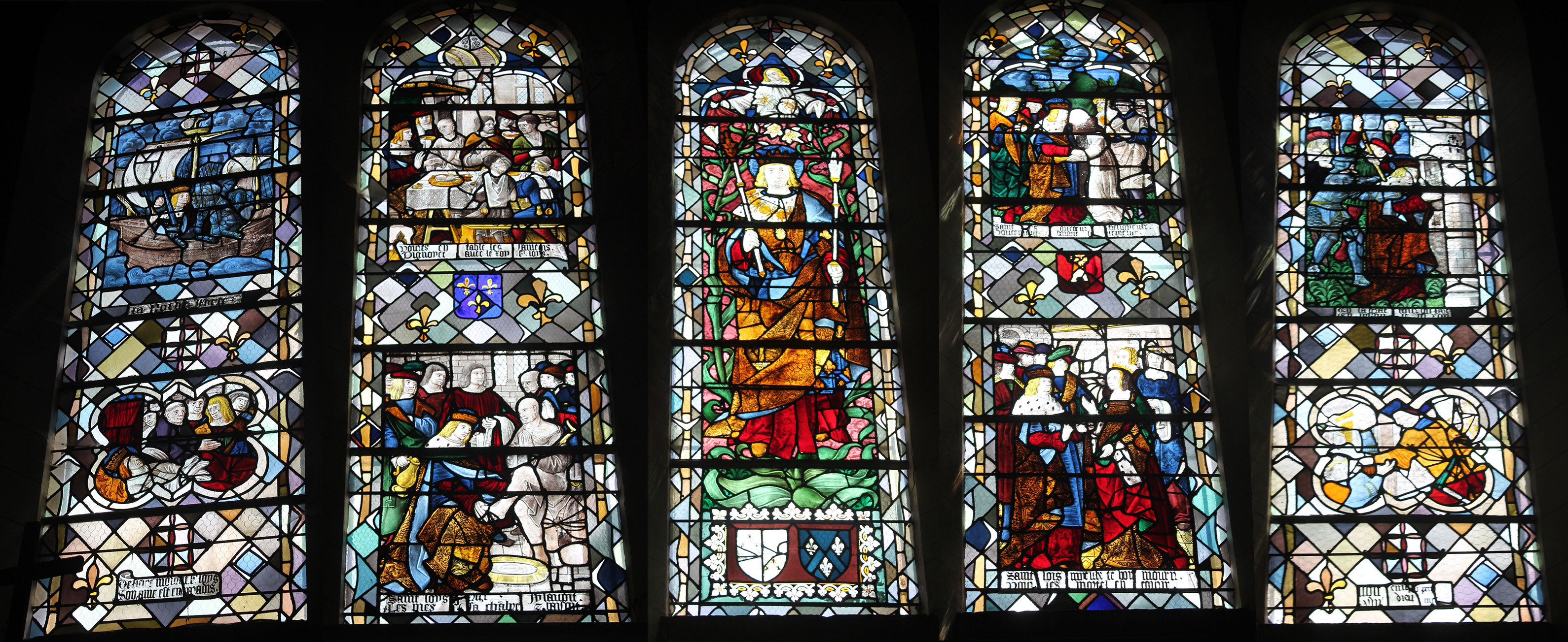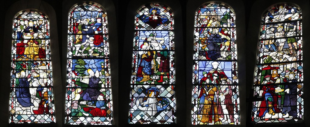 De gauche à droite : vitrail n°5, 4, 3, 2, 1.