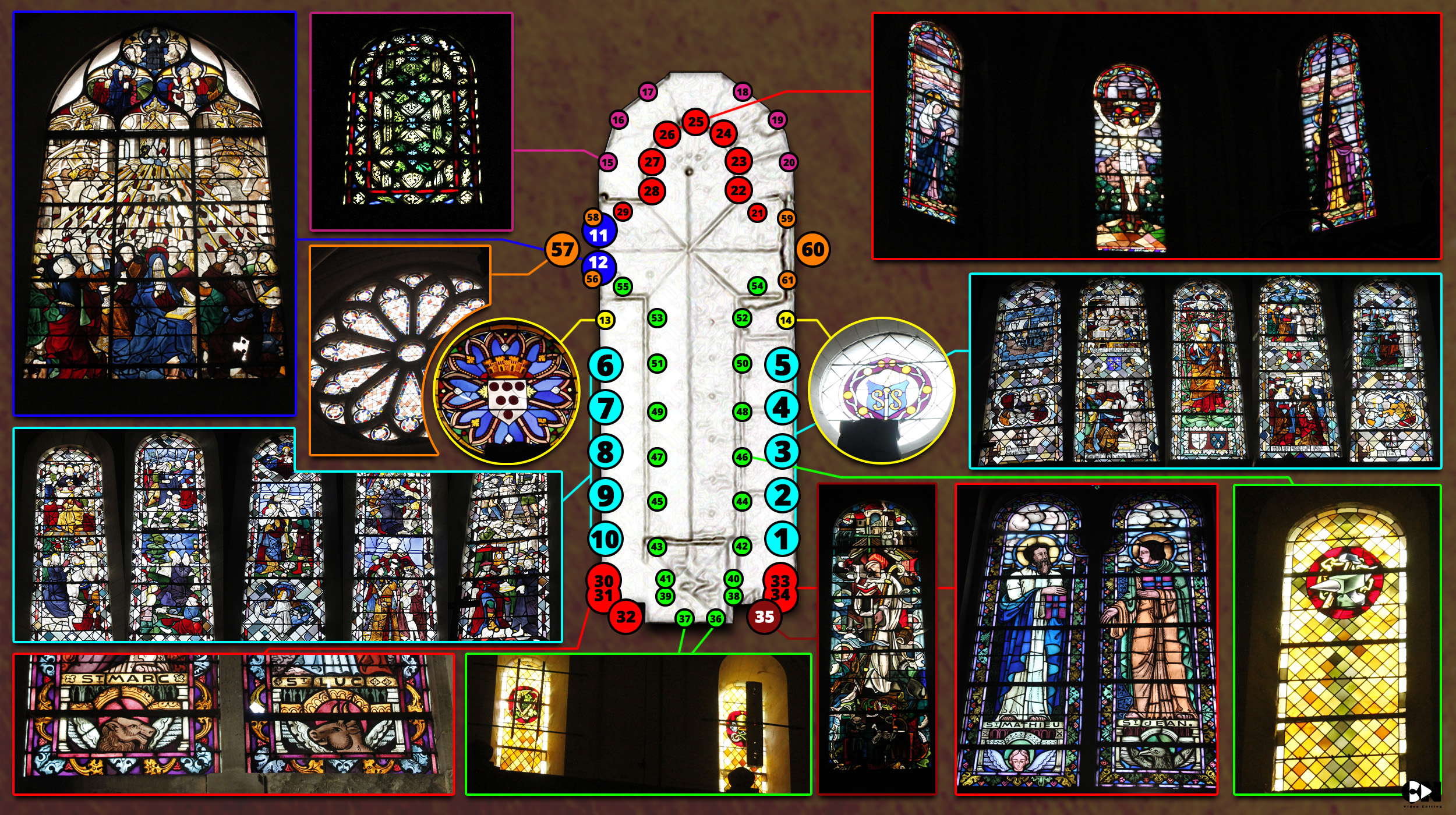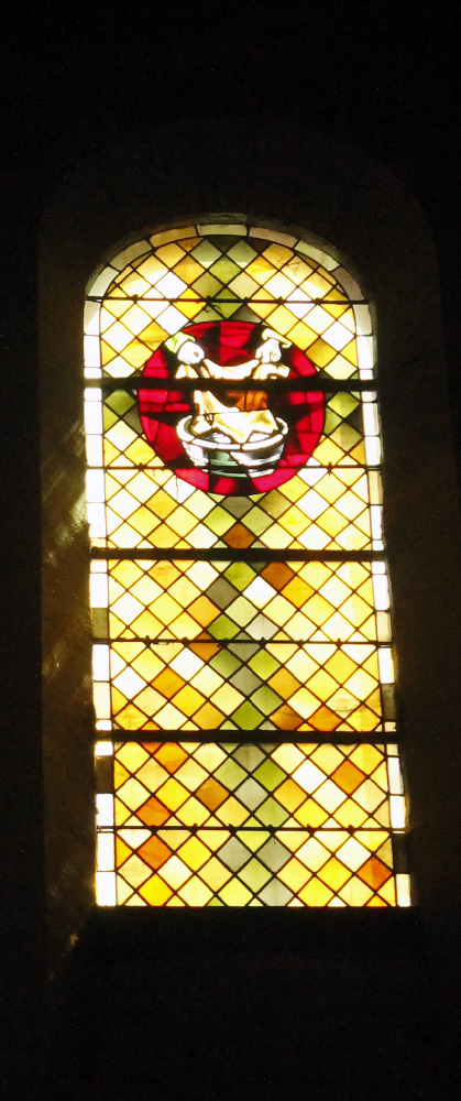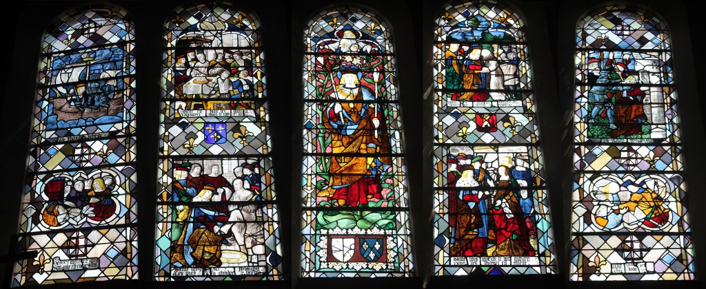 Pourquoi tout se tintouin bordélique ? En fait en 1840, nous raconte André Lejeune (1929), une extension avait été réalisée sur l’ancienne église a démontant un mur. Et lors de la reconstitution des vitraux, c’est là que tout se mélangea. Aujourd’hui tout est bien dans l’ordre, depuis 1957 (grâce à Jean-Jacques Gruber j’imagine, qui a rénové les vitraux cette année là).