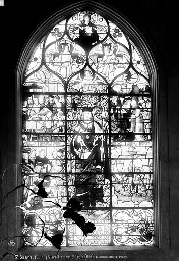Charles-Jacques Concedieu, « maire » de l’époque, aurait raconté en 1802 à Napoléon Bonaparte les détails d’un vitrail mettant en valeur la draperie (écrit l’abbé Cochet (1853)). Toute une industrie qui était un temps imposante dans la région la plus large possible, dont on ne connait pas grand chose concernant Saint-Saëns. Un vitrail qui aurait donc disparu entre 1802 et 1850. Par un incendie ? Un accident ? Un accident ? Une décision politique ?