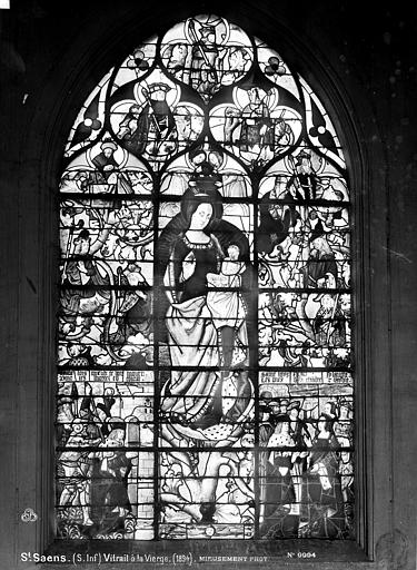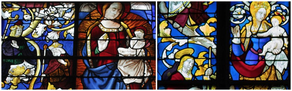 Une idée du maître-verrier ? André Lejeune (1929) évoque les ressemblances frappantes entre les vitraux des Scènes de la Passion et un vitrail de l’église Saint-Vincent de Rouen, supposant le même maître-verrier. Bon. Dommage, l’église en question n’est plus que ruines… Elle a subi un bombardement en 1944. Il n’existe plus que quelques-uns de ses vitraux ici et là, répertoriés sur patrimoine-histoire.fr. Ils datent ceux semblables aux vitraux saint-saënnais de 1520-1530, réalisé par un inconnu atelier rouennais influencé par le maître-verrier flamand « Arnoult de Nimègue qui avait quitté Rouen en 1513. » Est-ce quelqu’un de ce même atelier qui a réalisé les vitraux saint-saënnais ? Je le crois. En tout cas, c’est clairement dans cette mouvance de la Renaissance dont Arnoult de Nimègue fait partie. Une des caractéristiques de cette époque, outre les couleurs et les vêtements, c’est la Vierge Marie mieux mise en avant, qu’on retrouve notamment sur les deux vitraux du transept.