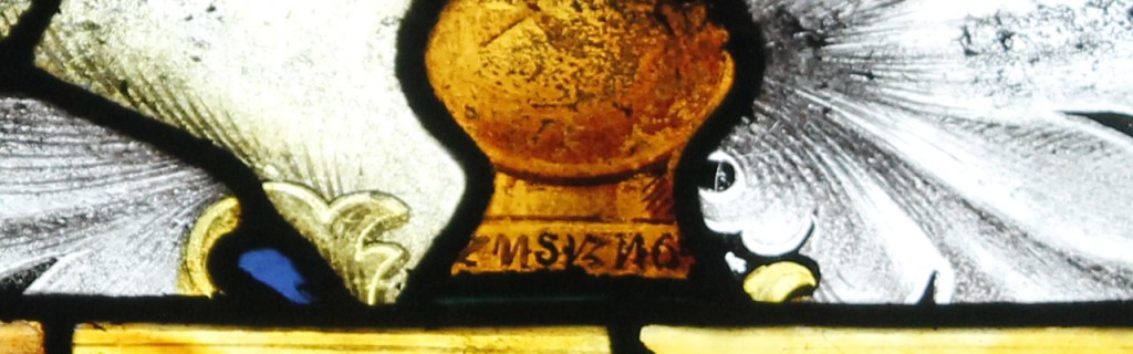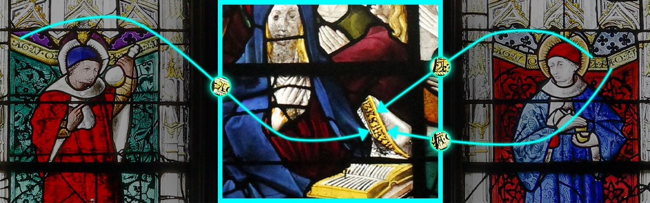 La réponse : non, a priori. Ce seraient des caractères fictifs, du pseudo-coufique (lavieb-aile.com), juste pour faire joli. Sur le vitrail de l’Assomption de Saint-Lô, il est écrit sur le bandeau derrière eux exactement la même chose, alors qu’il aurait dû désigner la personne représentée. Par conséquent, trouver une signification à ce qui est écrit, ici comme sur le vitrail saint-saënnais, serait totalement impossible. C’est quelque chose typiquement utilisée pendant la Renaissance. Avec des sigles aussi similaires, se pourrait-il que le vitrail de la Descente du Saint-Esprit soit lui-même réalisé par Arnoult de Nimègue ?