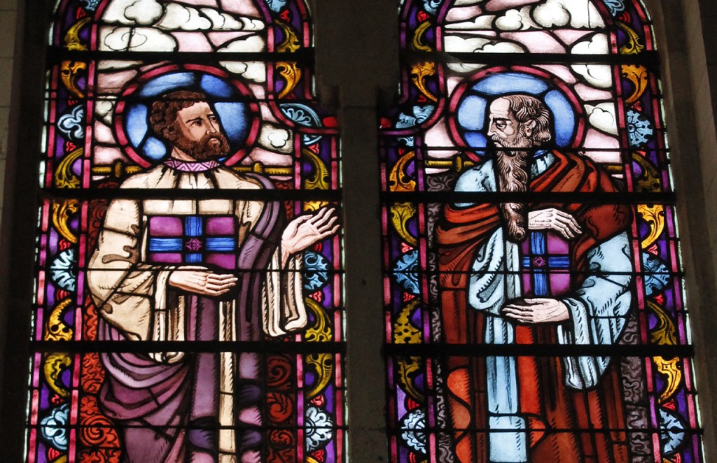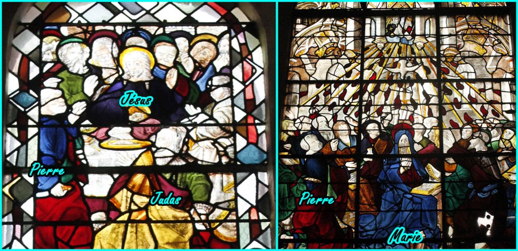 Les apôtres sur la vitrail de La Cène à gauche / Les apôtres sur le vitrail de la Descente du Saint-Esprit à droite