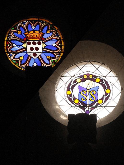 Deux petits vitraux ronds se faisant face, en symétrie, datent du XVIIème siècle. L’un représente l’écusson de la famille de Limoges (n°13) aujourd’hui repris en blason de la ville. L’autre est une curieuse armoirie d’une abbesse (n°14) qui pourraient étrangement collé pour symboliser Saint-Saëns avec ses deux S.
